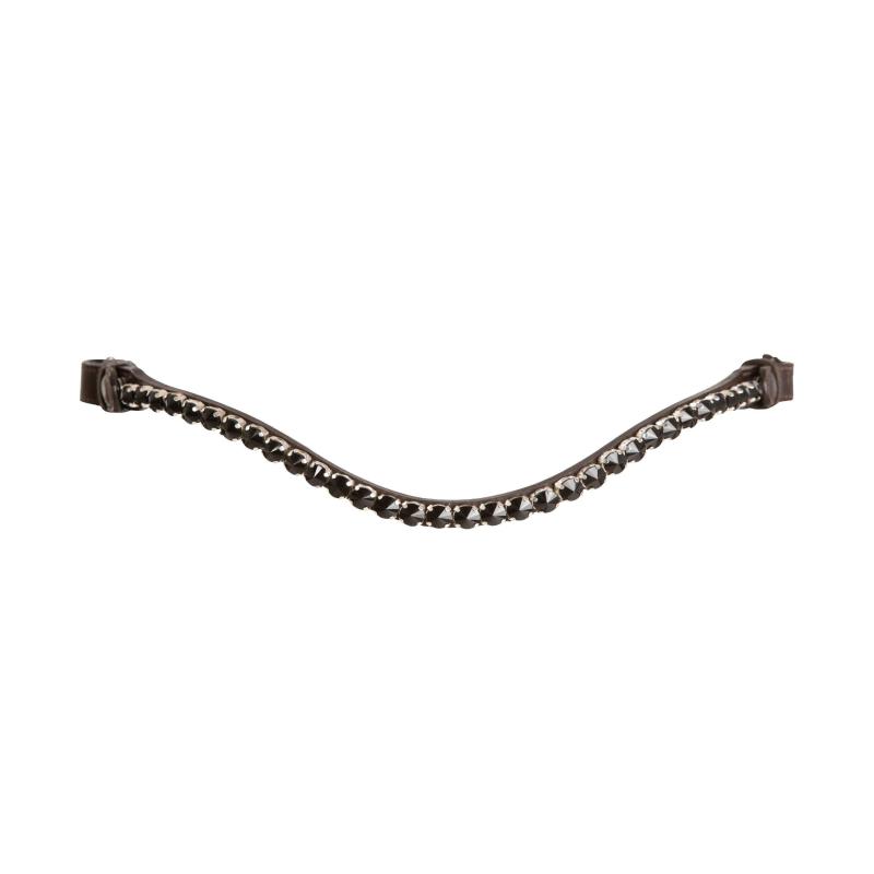 Rundsytt pannband i läder med böjd form, svarta kristaller och snabbknäppe. Finns i svart, brun, Cob–X-Full.