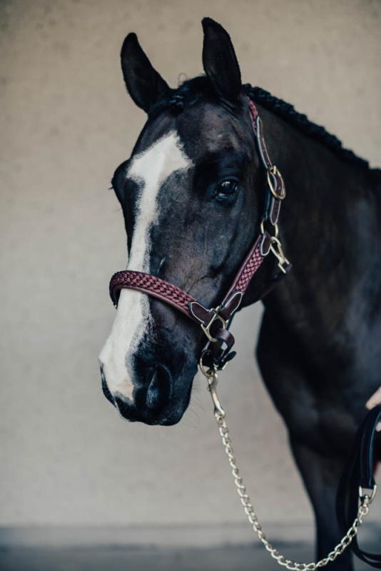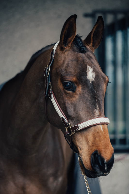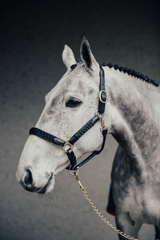 Grimma i finaste läder med mässingspännen. Grimman har extra vaddering på sidorna, i nacken samt över nosen . Grimman har detaljer i form utav fin, slitstark och flätad nylon.