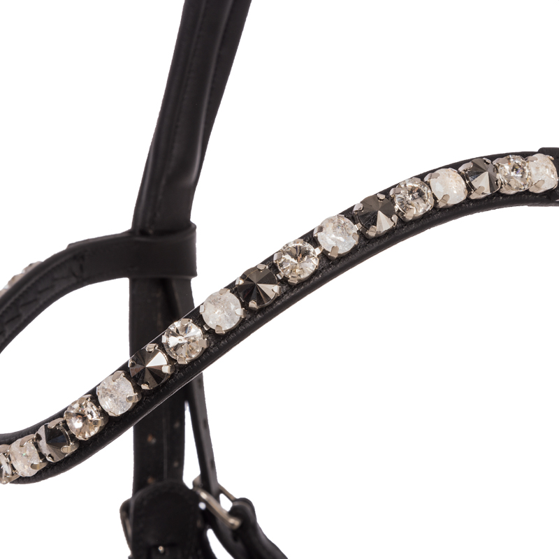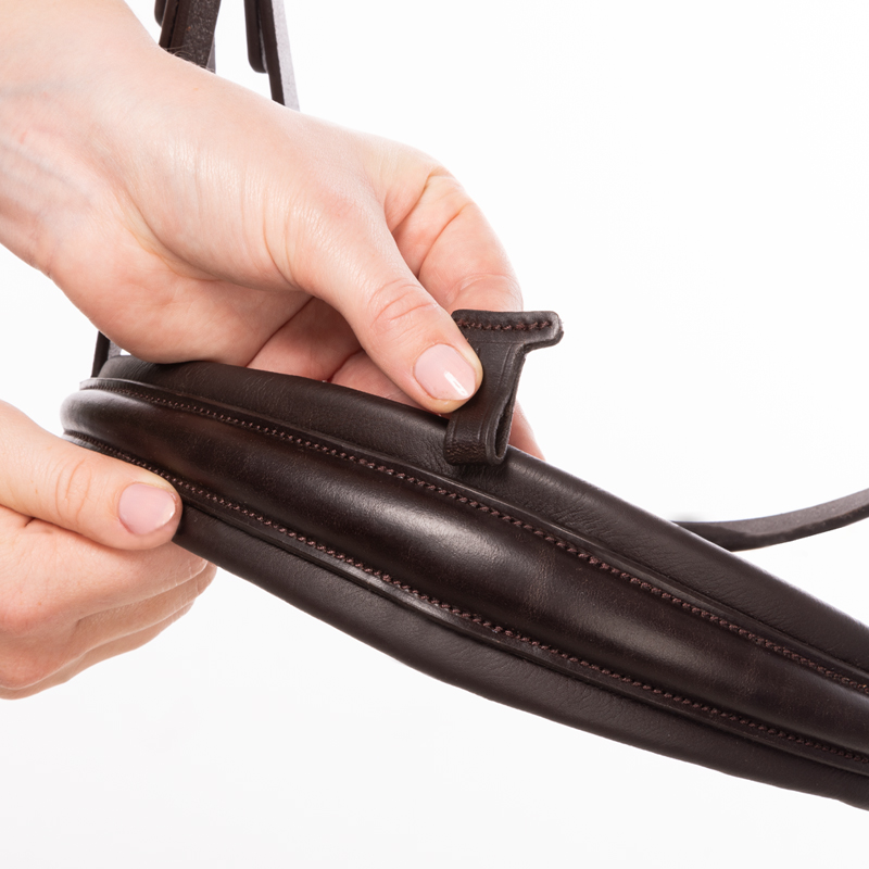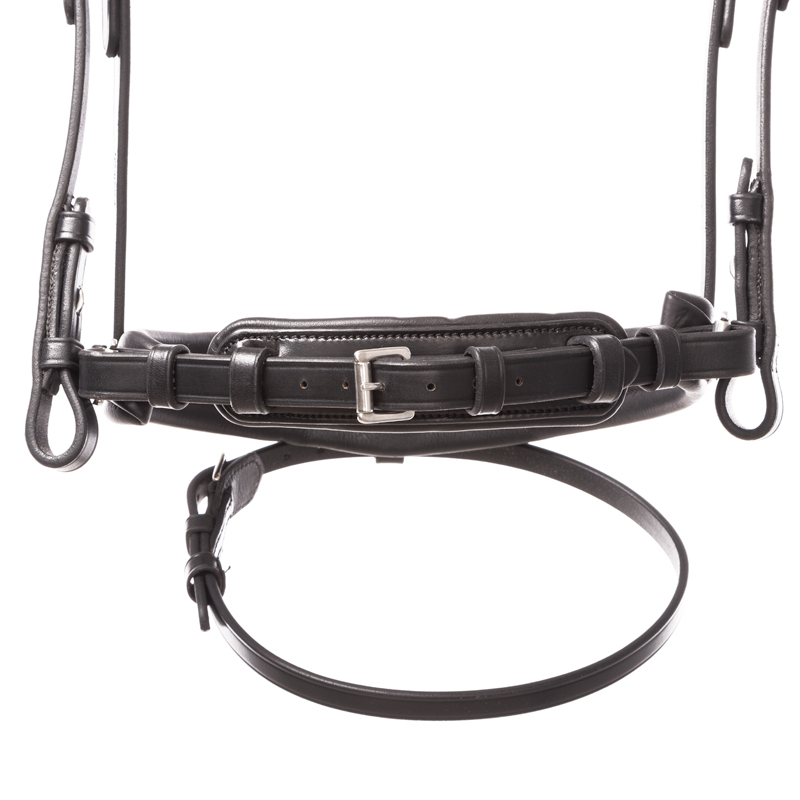 Tränset ”Zora” är tillverkat av högkvalitativt tyskt läder och har ett extra mjukt nackstycke med en mycket anatomisk utformning. Den mjuka stoppningen i både nosgrimma och pannband ger hästen extra komfort. Nosgrimman är justerbar på båda sidor. Tränset levereras utan tyglar.