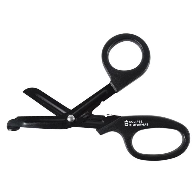 Sax specialdesignad för bandage, wetwraps, textil, kompresser, plåster och andra häftande material. Optimal att ha i alla typer av förbandslådor och hjälpen-lådor. Saxen är tillverkad i rostfritt stål, men ett greppvänligt handtag av plats. Bred undersida, för att undvika att hästen skadas om förbanden behöver appliceras direkt på. Ett måste i alla stallapotek!