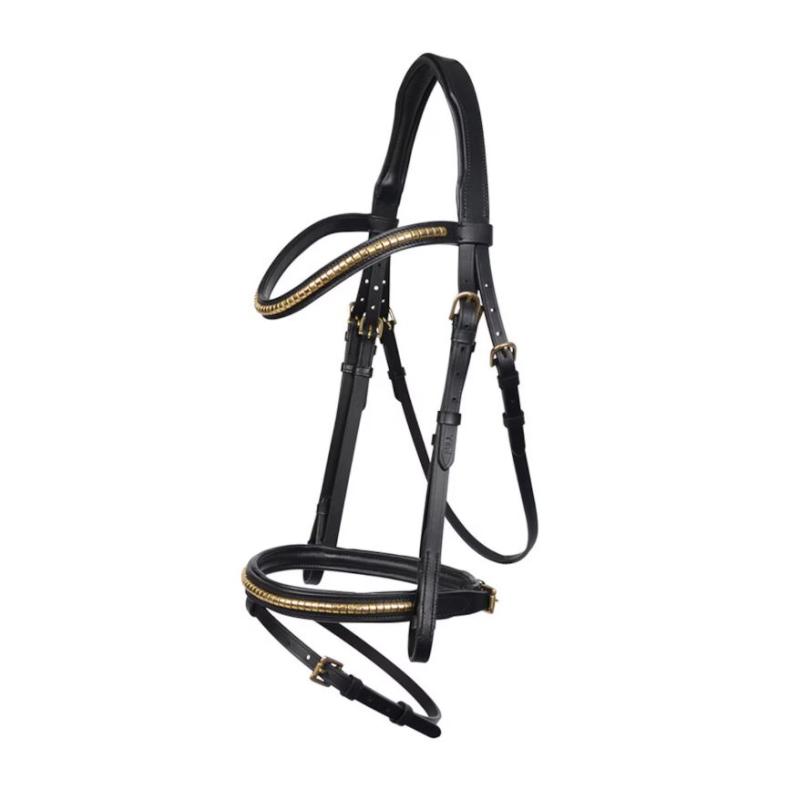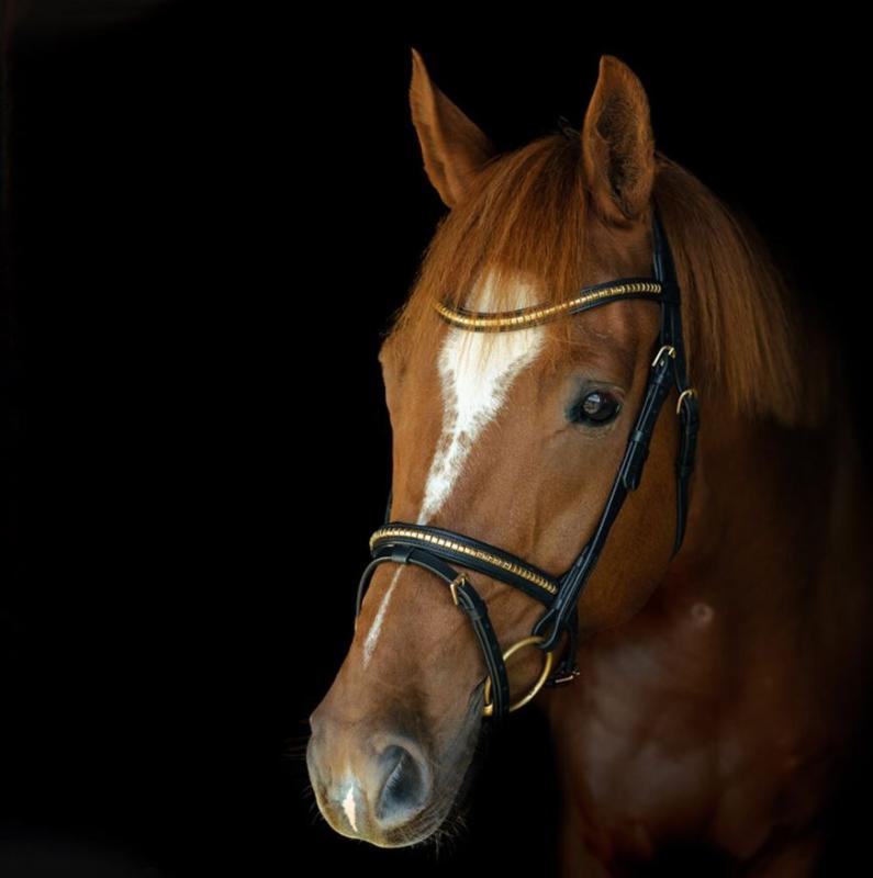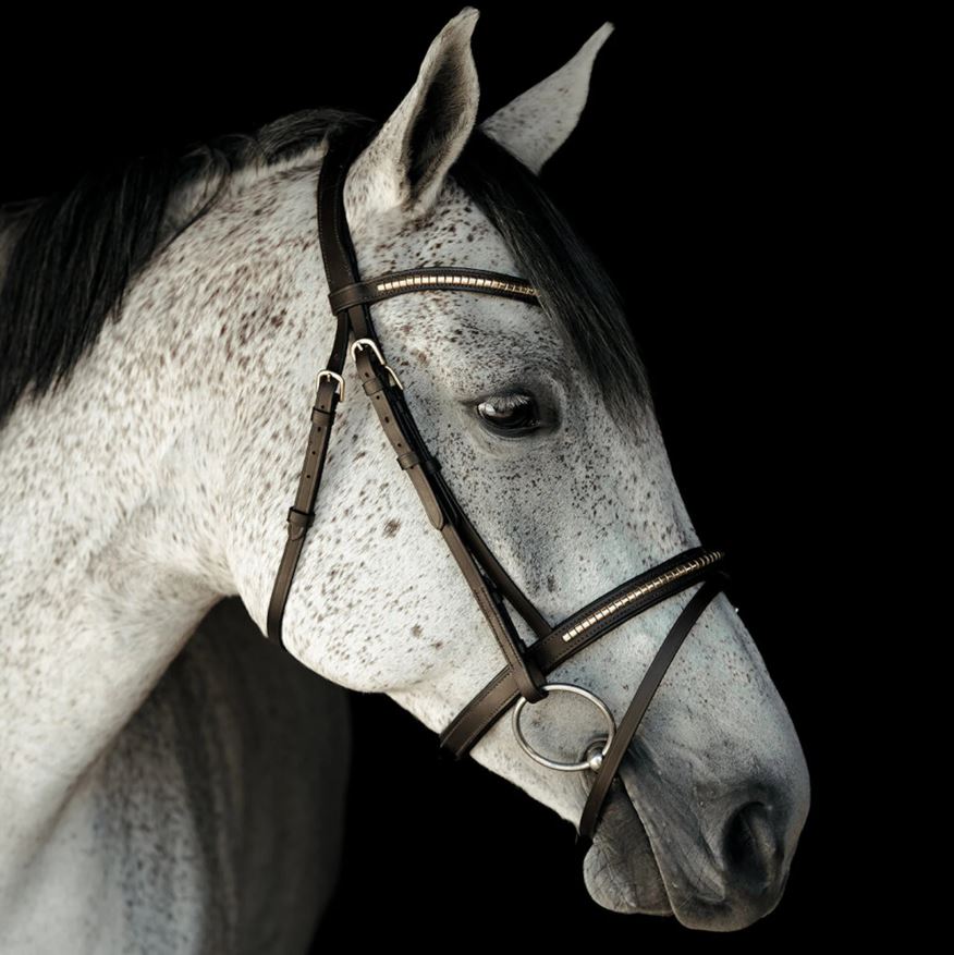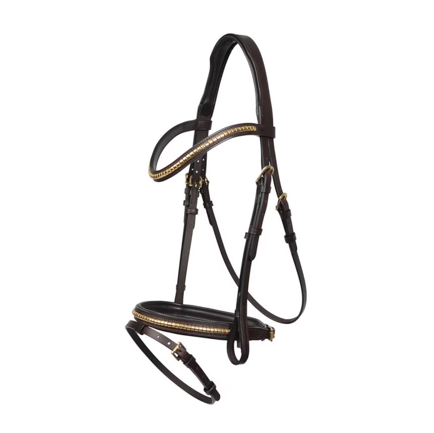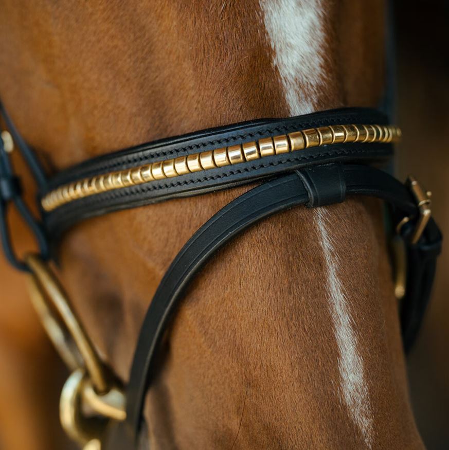 Både nosgrimma och nackstycke är dekorerade med mässingsfärgade clinchers, vilket ger tränset ett elegant och traditionellt uttryck.