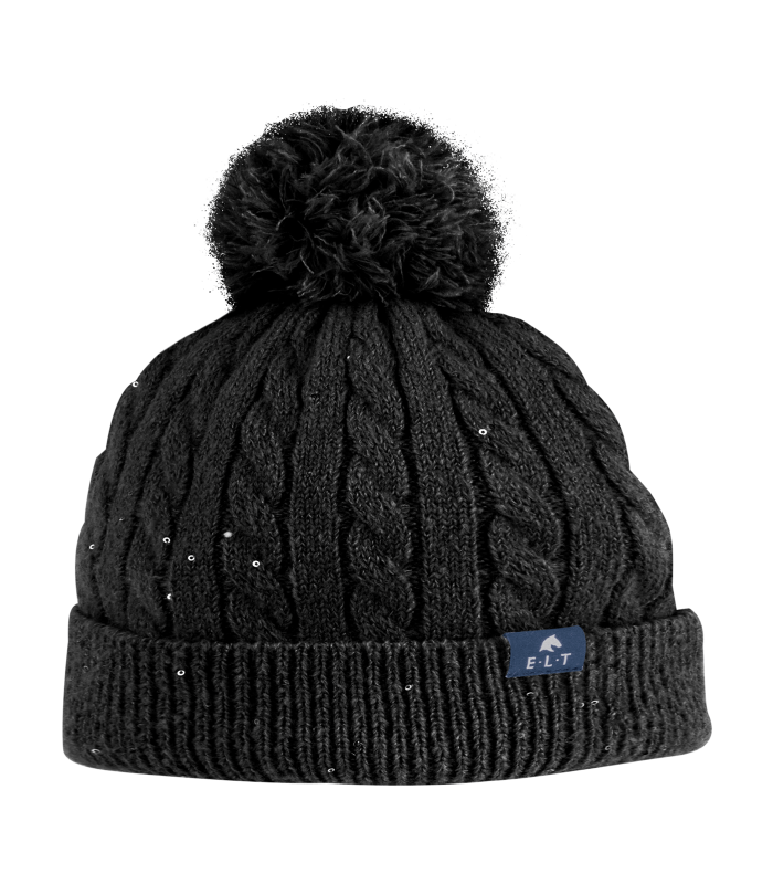 Stickad E·L·T-mössa med paljetter, fleecefoder och tofs – varm, trendig och bekväm.