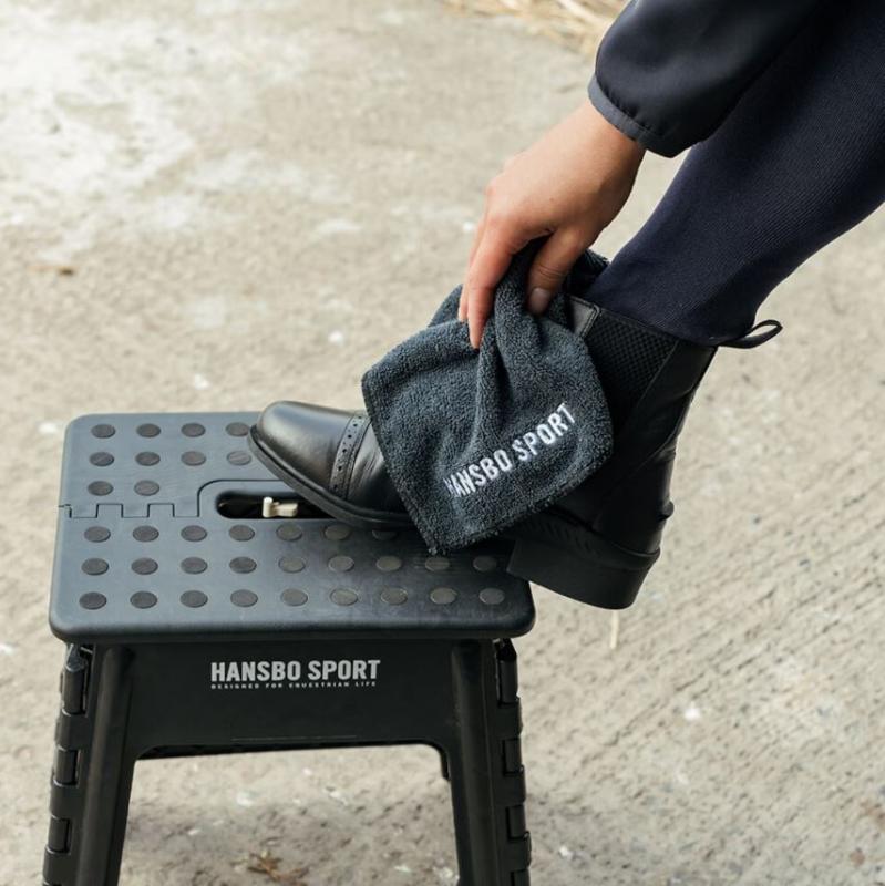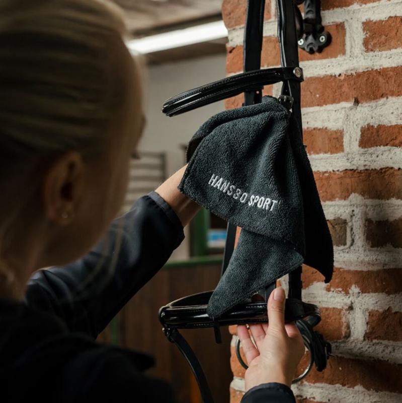 Praktiskt och funktionell putshandduk i microfiber, med broderad Hansbo Sport logga. Designad med en liten ögla för upphängning. Opimal att använda på hästen, vid persedelvård eller vid den sista putsen av stövlarna på tävlingsplatsen. 35cmx34cm.