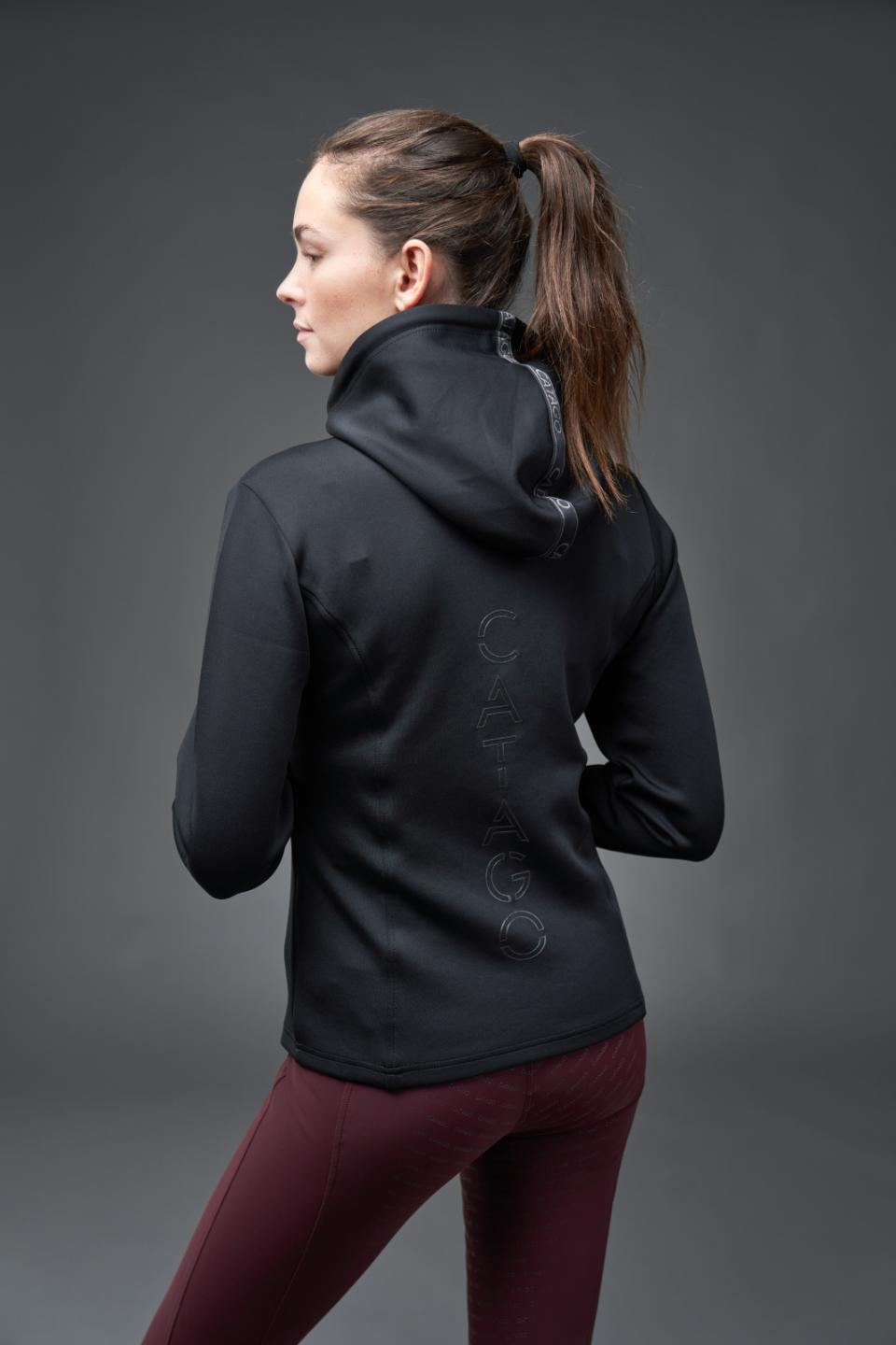 Sportig hoodie från Catago med dragkedja, perfekt för både ridning och träning. Tillverkad i ett kraftigt material med tvåvägsstretch som ger en följsam passform och god formstabilitet. Tyget har mycket bra andningsförmåga och håller dig sval även under intensiva pass. Designen förstärks av atletiska detaljer som logotryck på ryggen, präglad logotyp på bröstet, invändigt logoband i huvan, logosnören samt gummerade dragkedjor.