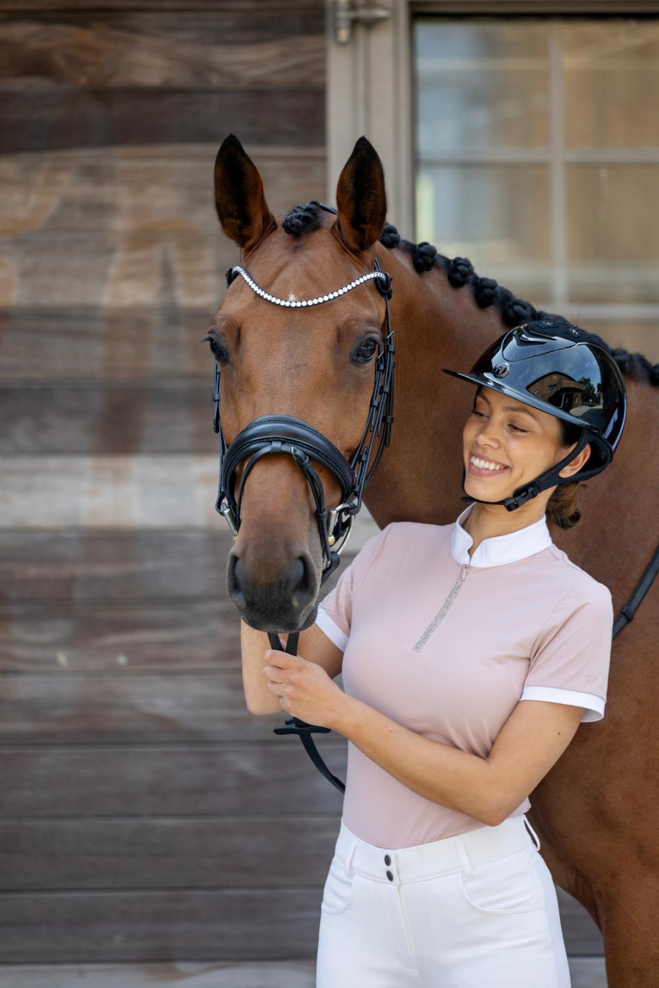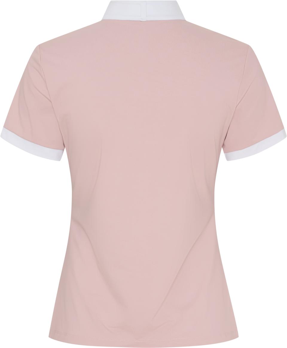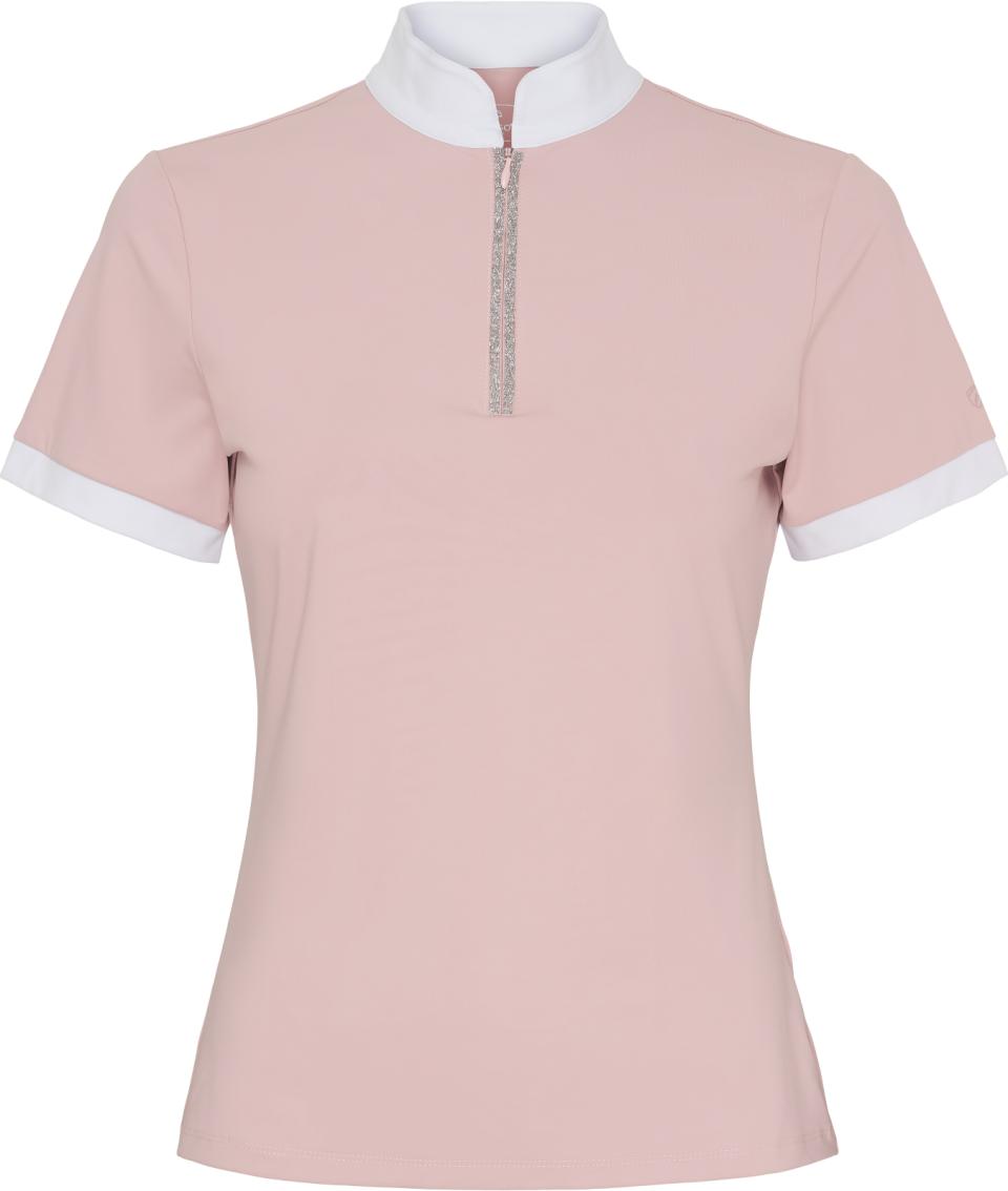 Kortärmad, figurnära tävlingstopp från Catago med hög krage – perfekt för både tävling och vardag. Vita detaljer vid ärmslut och krage ger en klassisk och stilren look. Den främre dragkedjan är dekorerad med kristaller som tillför ett diskret skimmer. Tonal logotyp med metallisk effekt på vänster ärm samt broderad logotyp i kragen. Materialet är snabbtorkande, fukttransporterande, antibakteriellt och ger en sval känsla. Tyget har även UV-skydd (UPF 50+), vilket innebär att det släpper igenom cirka 5 % av solens strålar. Observera att skyddet kan minska om plagget töjs ut eller blir vått.