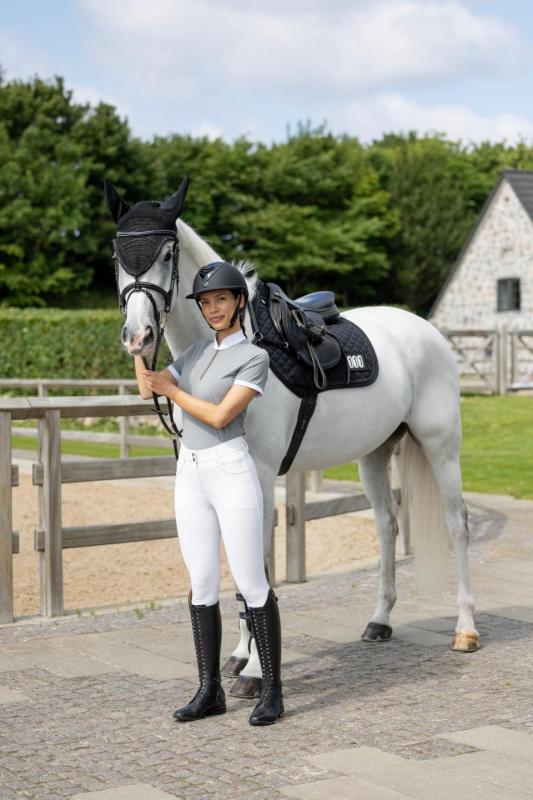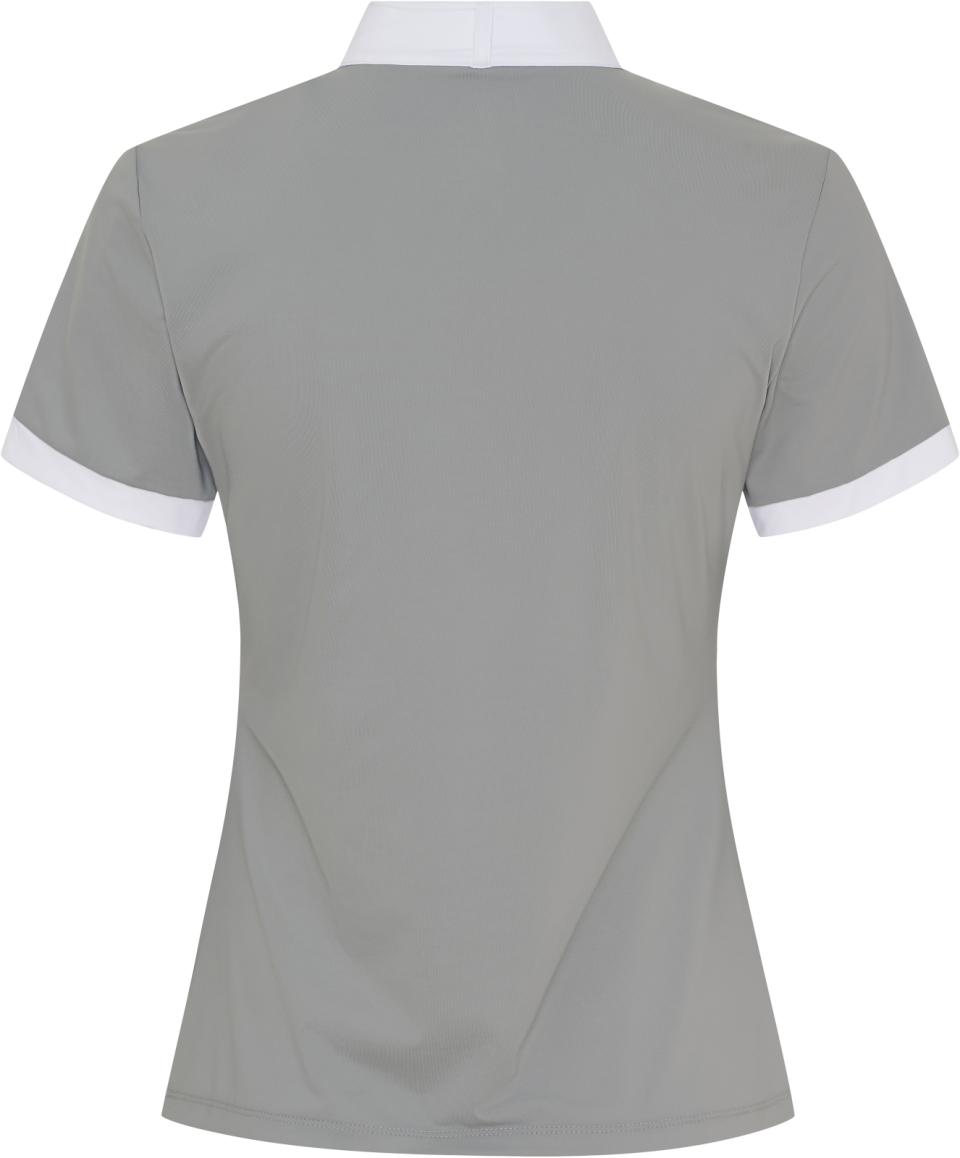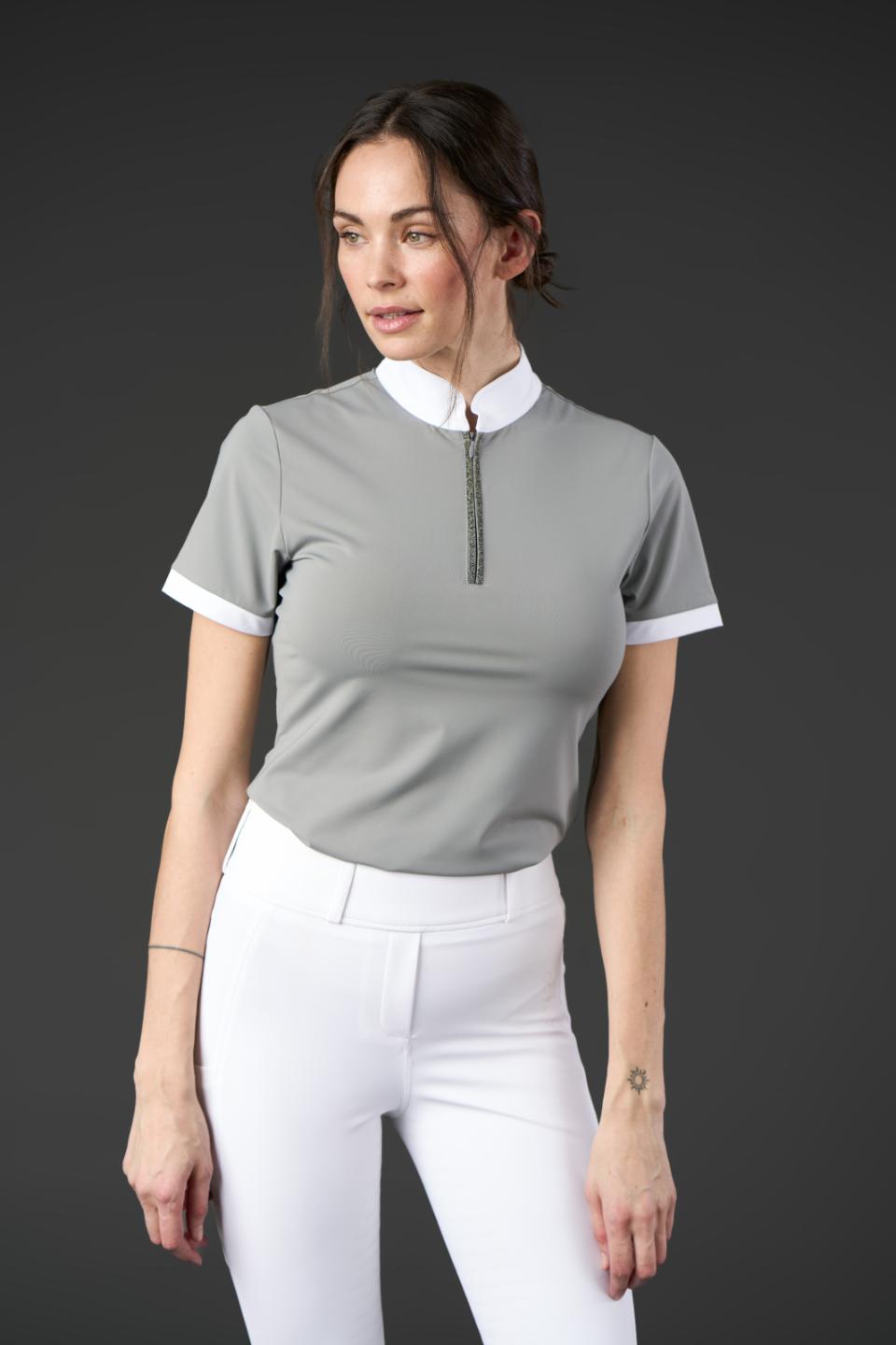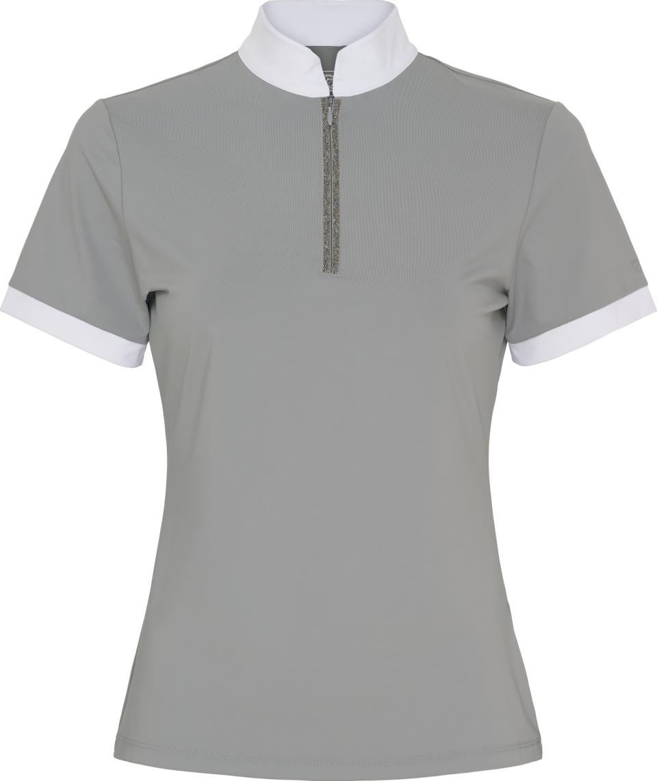 Kortärmad, figurnära tävlingstopp från Catago med hög krage – perfekt för både tävling och vardag. Vita detaljer vid ärmslut och krage ger en klassisk och stilren look. Den främre dragkedjan är dekorerad med kristaller som tillför ett diskret skimmer. Tonal logotyp med metallisk effekt på vänster ärm samt broderad logotyp i kragen. Materialet är snabbtorkande, fukttransporterande, antibakteriellt och ger en sval känsla. Tyget har även UV-skydd (UPF 50+), vilket innebär att det släpper igenom cirka 5 % av solens strålar. Observera att skyddet kan minska om plagget töjs ut eller blir vått.