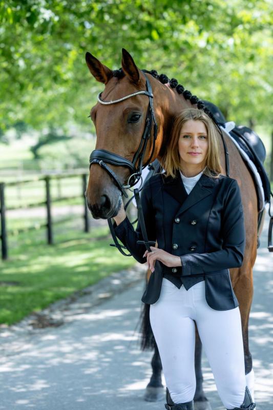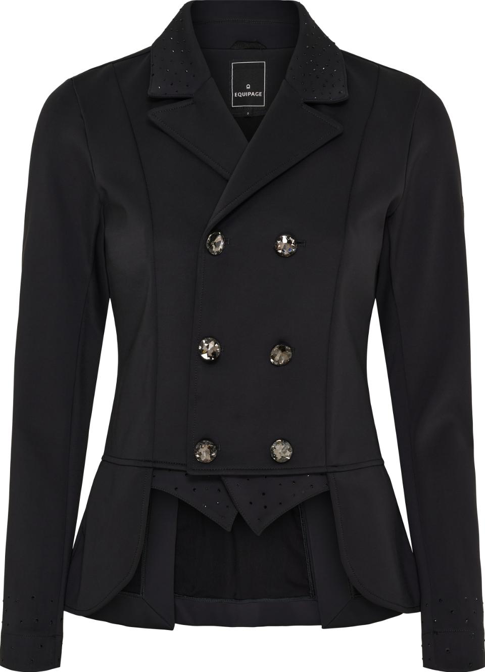 Elegant och stilren tävlingsfracket från Equipage med klassiska ficklock och dubbel knäppning med fyra knappar framtill. Fracketten är försedd med ridventiler baktill för optimal rörelsefrihet i sadeln. Krage, ficklock och en insats baktill är dekorerade med små strasstenar som ger en diskret glittrande effekt, samt en ton-i-ton glitterlogga på vänster överärm. Materialet är mycket stretchigt med en slät yta som ger både hög komfort och en smickrande passform.