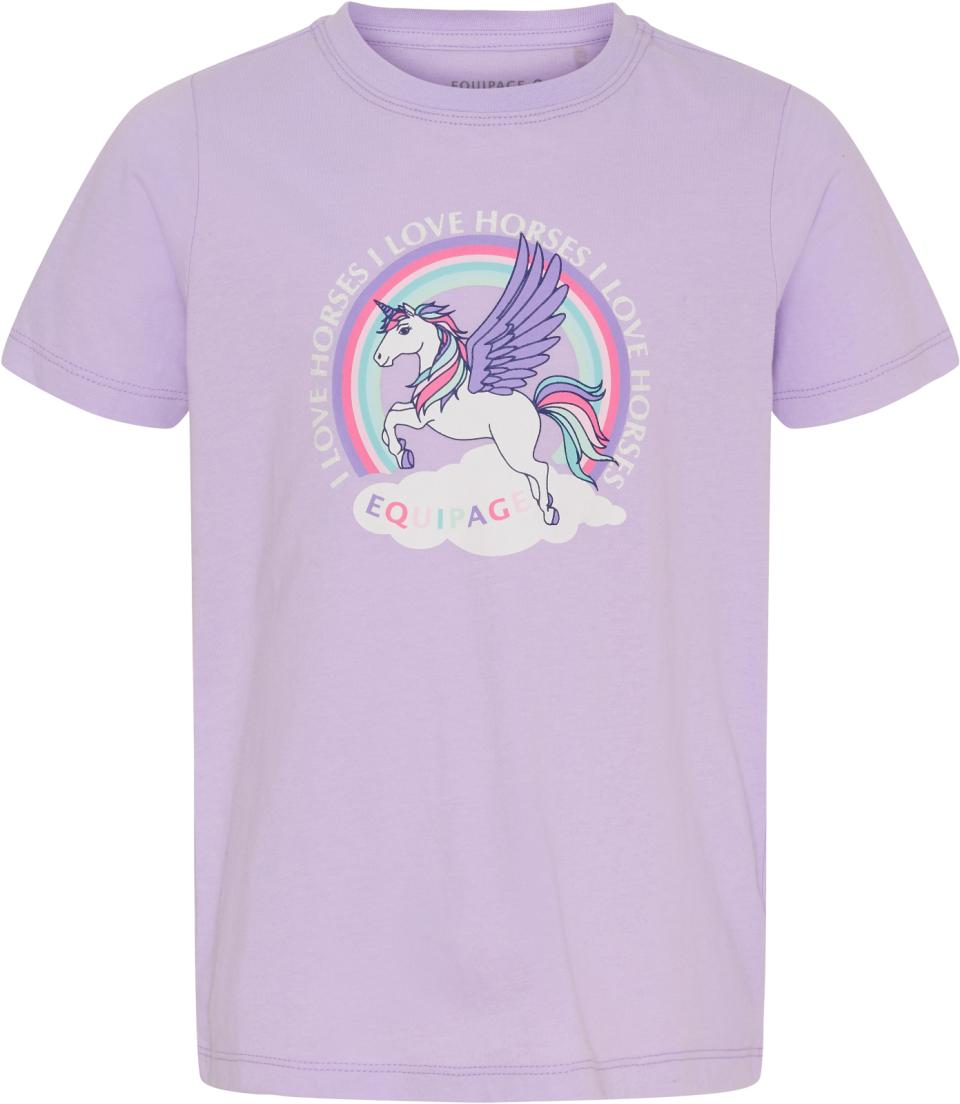 Kortärmad T-shirt från Equipage i juniorstorlek med rundad halsringning. Tröjan har ett stort, färgglatt enhörningstryck med glittereffekt som ger en lekfull och glittrande look. Även logotrycket i nacken har en fin glitterdetalj. Tillverkad i mjuk och skön bomullsjersey för hög komfort hela dagen.