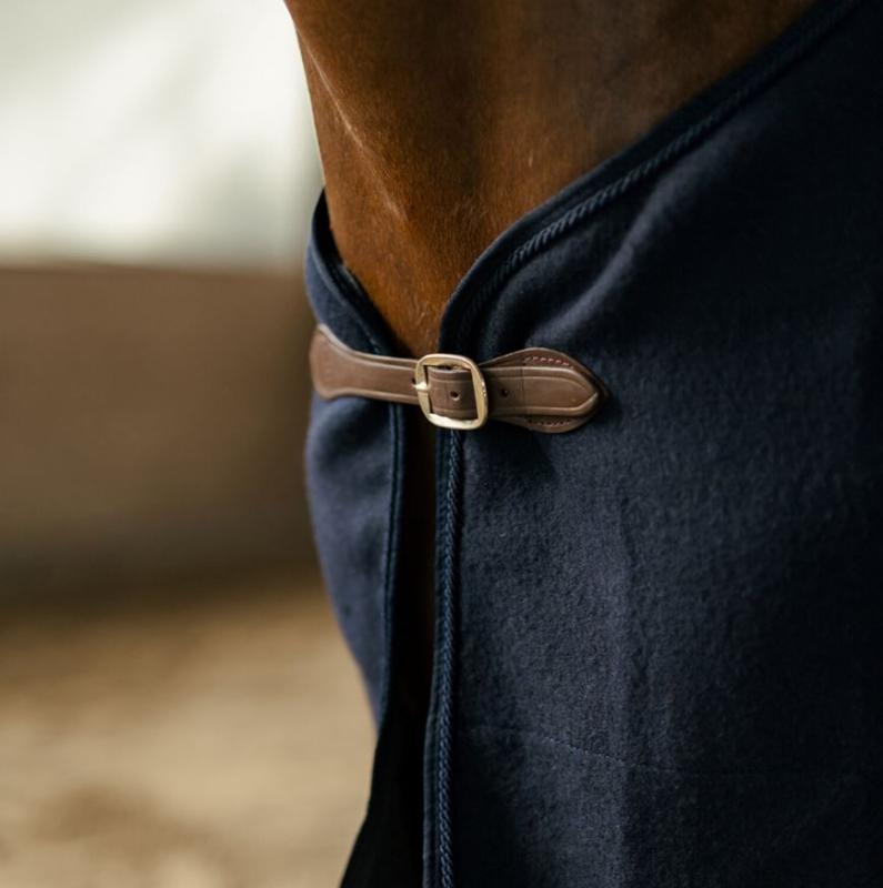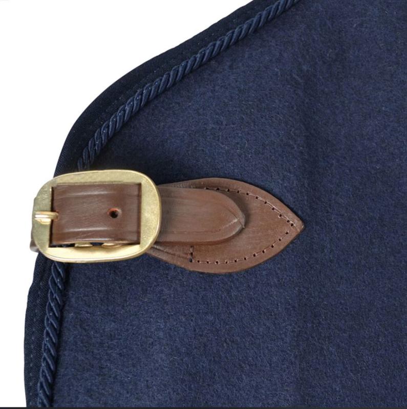 Täcke i kraftig ullblanding som håller hästen varm och torr, designat med dekorativ matchande passpoal. Avtagbara kryssgjordar samt vacker frontknäppning i läder. Optimalt för användning under framridning, efter träning eller som transporttäcke. Plats för egen brodyr. 80% ull, 20 % övriga textilfibrer.
