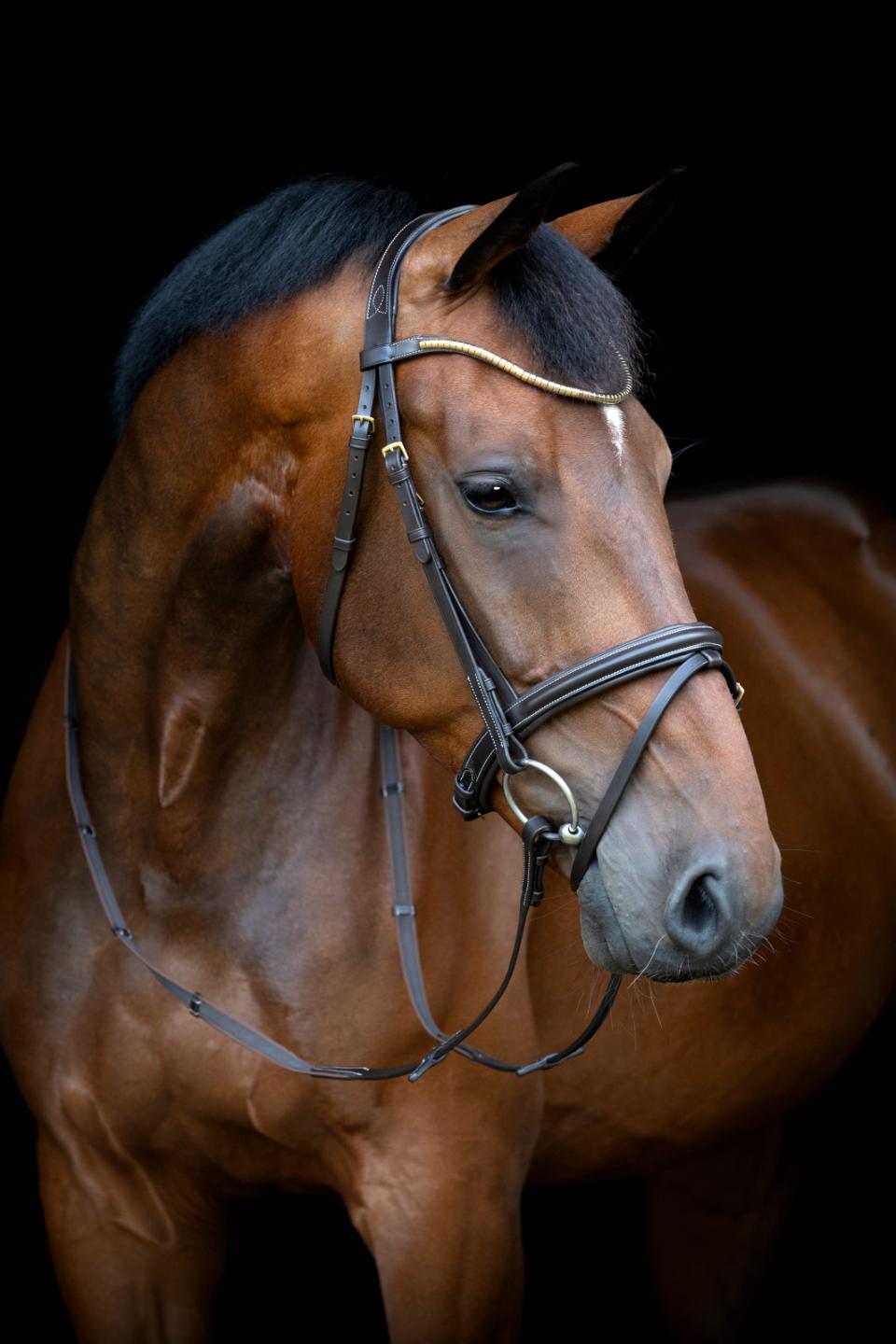 Träns från Horse Guard med kombinerad nosgrimma, mjukt och generöst vadderat i läder för hög komfort. Utrustat med aachennosgrimma (flash) och ett ana