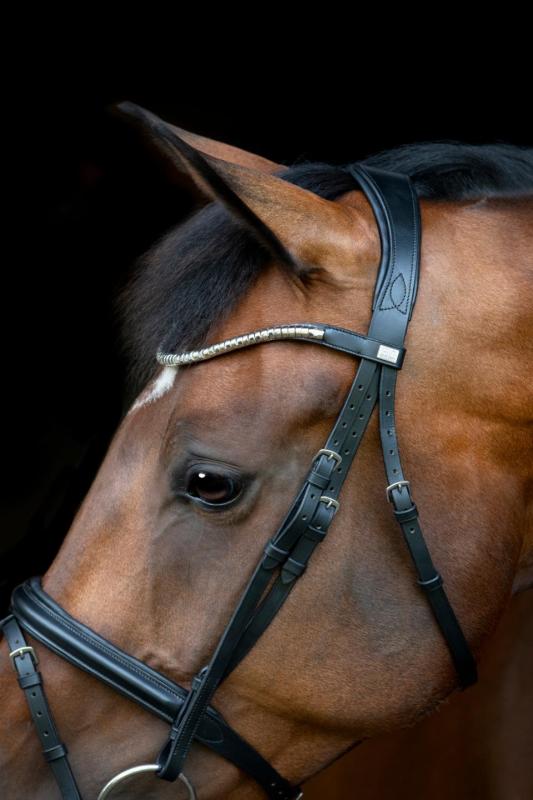 Träns från Horse Guard med kombinerad nosgrimma, mjukt och generöst vadderat i läder för hög komfort. Utrustat med aachennosgrimma (flash) och ett ana