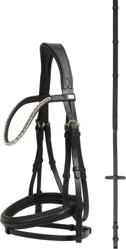 Träns från Horse Guard med kombinerad nosgrimma, mjukt och generöst vadderat i läder för hög komfort. Utrustat med aachennosgrimma (flash) och ett anatomiskt utformat nackstycke med extra mjuk vaddering som avlastar trycket. Pannband med clinchers ger en klassisk och stilren look. Försett med franska hakar på bettremmarna för enkel justering. Levereras med 16 mm supergrip-tyglar.