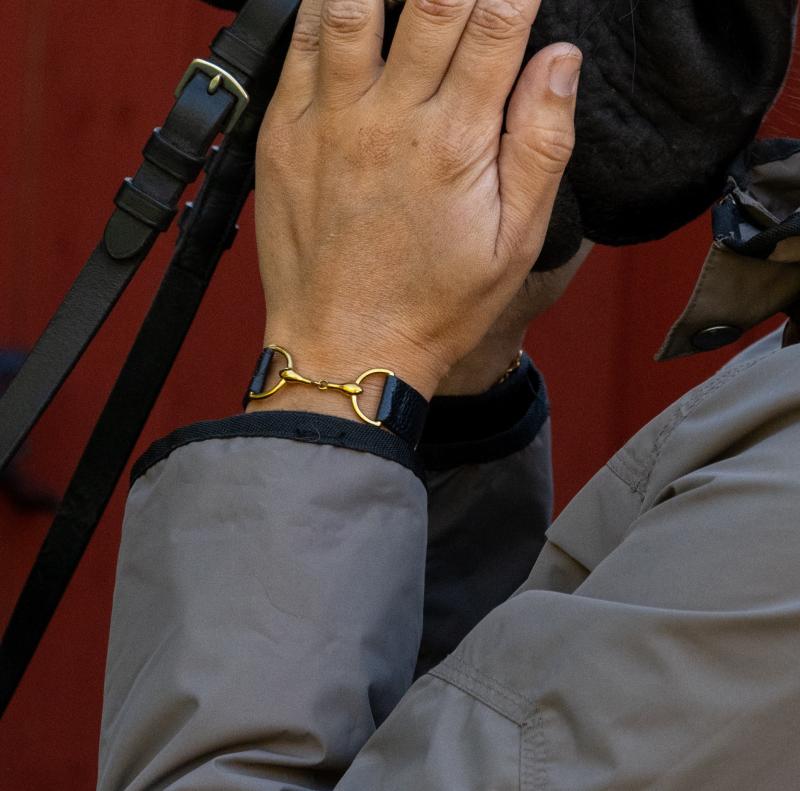 Vår lyxiga orginaldesign! Ett unikt armband med ett bett och spänne i glänsande guldpläterat stål och band av svart läder. Precis som med dina favoritskor blir armbandet mjukare och skönare ju mer du bär det. Perfekt oavsett om du letar efter en present till hästtjejen eller bara vill unna dig själv något vackert. Storlek SMALL/MEDIUM - justerbar längd från 14,5 cm till 18,5 cm.