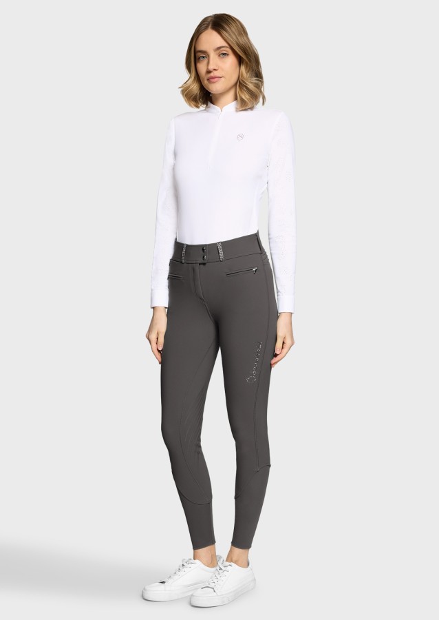 Tillverkade i ett premium italienskt tyg som är stretchigt, andningsbart och slitstarkt, erbjuder Claranova maximal komfort även under intensiva ridpass. Diskreta Swarovski Crystal Fabric-detaljer på bälteshällor och bakfickor ger en exklusiv och elegant finish, medan den ikoniska Samshield-vecken baktill förstärker den stilrena designen.