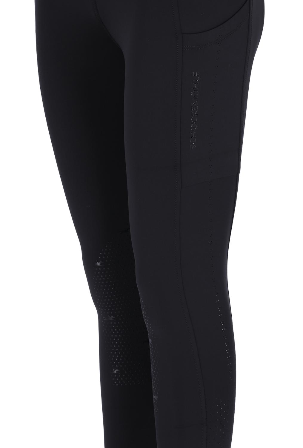 Perforeringar längs sidorna och nedre delen av benen förbättrar ventilationen och ger extra andningsförmåga under intensiva pass. Den mjuka, mycket elastiska linningen med bälteshällor ger en smickrande passform och möjlighet att styla med bälte. En elegant hästlogotyp på den bakre hällan sätter pricken över i:et.